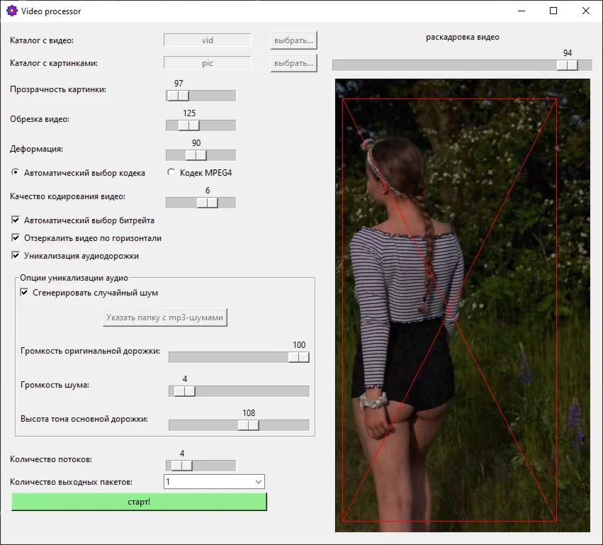 Софт предоставляет множество возможностей для обработки видео, включая нанесение прозрачных изображений поверх видео, искажение геометрии, обрезание и удаление метаданных из видео. Благодаря этому можно заливать видео в тикток (Tik-Tok), instagram reels и подобные сервисы, которое на сайте уже есть, и проходить тем самым проверку на уникальность видео. Вы можете выбирать битрейт и уровень сжатия выходных видео и даже автоматически выбирать кодек для достижения максимального качества.