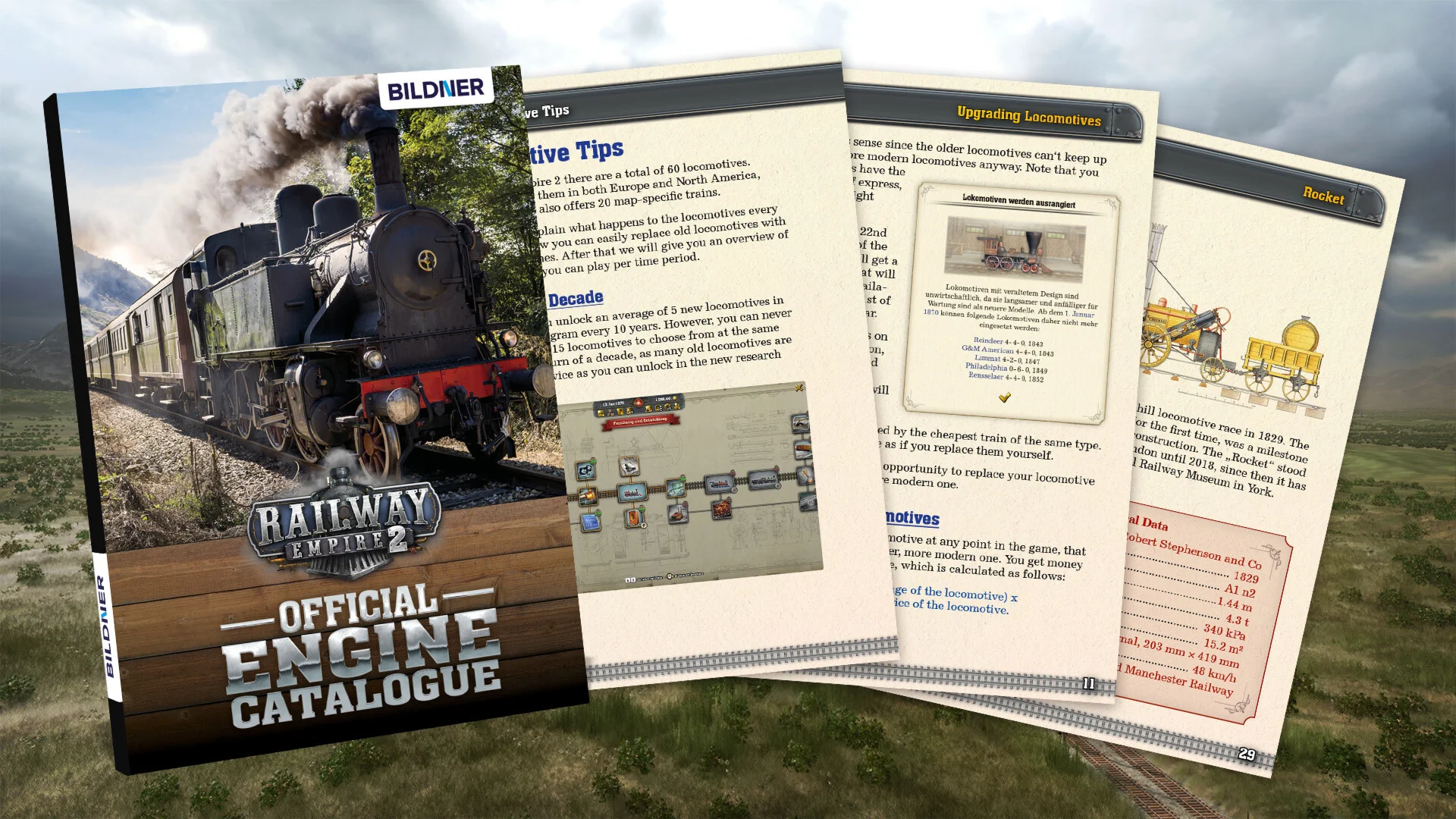 The Engine Catalogue contains all 60 locomotives of the game with their most important data such as speed, price, train performance and much more.