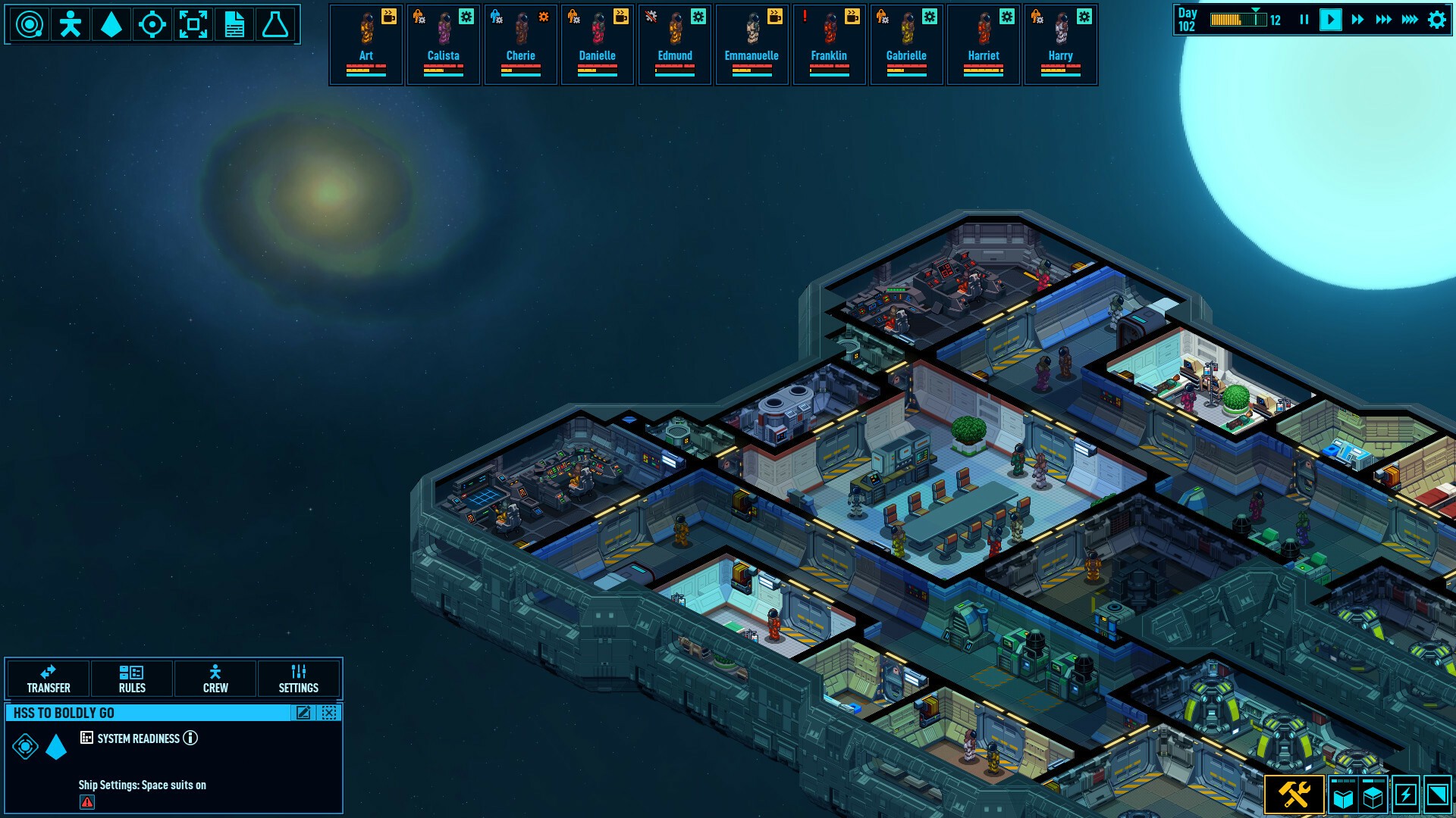 Условия: члены экипажа могут чувствовать тягу к приключениям, страдать от голода и проблем с гигиеной или просто переесть. Различные условия влияют на их самочувствие.