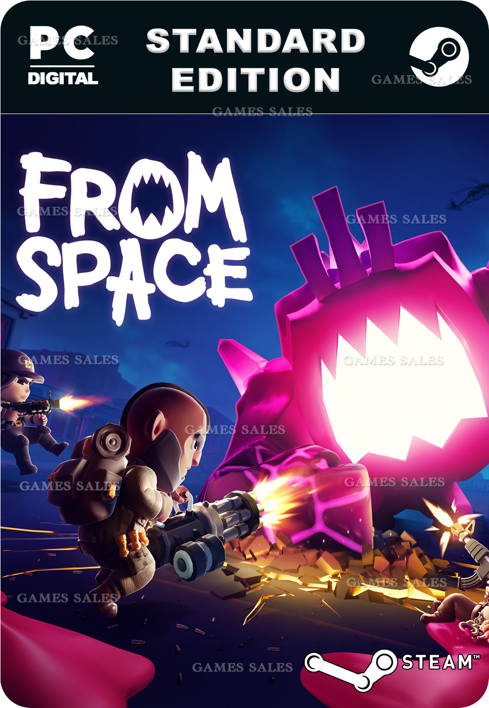 Хотя в From Space можно играть в одиночку (если у вас хватит смелости), будет разумнее позвать на помощь друзей. В онлайн-режиме можно собрать команду из четырех человек. Розовых тварей много, так что чем больше людей, тем лучше! Кроме того, кто-то же должен рассказать, как круто вы смотрелись?