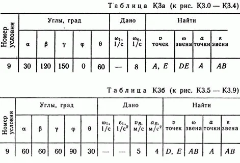 Решение задачи К3 Вариант 59. Задание: Плоский механизм состоит из стержней 1, 2, 3, 4 и ползуна В или Е (рис. КЗ.0 — К3.7) или из стержней 1, 2, 3 и ползунов В и E (рис. К3.8, К3.9), соединенных друг с другом и с неподвижными опорами O1, O2 шарнирами; точка D находится в середине стержня АВ. Длины стержней равны соответственно l1 = 0,4 м, l1 = 1,2 м, l3 = 1,4 м, l4 = 0,6 м. Положение механизма определяется углами α, β, γ, φ, θ. Значения этих углов и других заданных величин указаны в табл. КЗа (для рис. 0—4) или в табл. КЗб (для рис. 5—9); при этом в табл. КЗа ω1 и ω4 — величины постоянные. Определить величины, указанные в таблицах в столбцах «Найти». Дуговые стрелки на рисунках показывают, как при построении чертежа механизма должны откладываться соответствующие углы: по ходу или против хода часовой стрелки (например, угол γ на рис. 8 следует отложить от DB по ходу часовой стрелки, а на рис. 9 — против хода часовой стрелки и т. д.). Построение чертежа начинать со стержня, направление которого определяется углом α; ползун с направляющими для большей наглядности изобразить так, как в примере КЗ (см. рис. КЗб). Заданные угловую скорость и угловое ускорение считать направ¬ленными против часовой стрелки, а заданные скорость vB и ускорение аB — от точки В к b (на рис. 5—9).