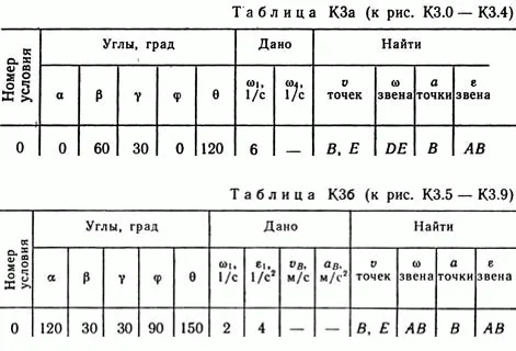 Решение задачи К3 Вариант 50. Задание: Плоский механизм состоит из стержней 1, 2, 3, 4 и ползуна В или Е (рис. КЗ.0 — К3.7) или из стержней 1, 2, 3 и ползунов В и E (рис. К3.8, К3.9), соединенных друг с другом и с неподвижными опорами O1, O2 шарнирами; точка D находится в середине стержня АВ. Длины стержней равны соответственно l1 = 0,4 м, l1 = 1,2 м, l3 = 1,4 м, l4 = 0,6 м. Положение механизма определяется углами α, β, γ, φ, θ. Значения этих углов и других заданных величин указаны в табл. КЗа (для рис. 0—4) или в табл. КЗб (для рис. 5—9); при этом в табл. КЗа ω1 и ω4 — величины постоянные. Определить величины, указанные в таблицах в столбцах «Найти». Дуговые стрелки на рисунках показывают, как при построении чертежа механизма должны откладываться соответствующие углы: по ходу или против хода часовой стрелки (например, угол γ на рис. 8 следует отложить от DB по ходу часовой стрелки, а на рис. 9 — против хода часовой стрелки и т. д.). Построение чертежа начинать со стержня, направление которого определяется углом α; ползун с направляющими для большей наглядности изобразить так, как в примере КЗ (см. рис. КЗб). Заданные угловую скорость и угловое ускорение считать направ¬ленными против часовой стрелки, а заданные скорость vB и ускорение аB — от точки В к b (на рис. 5—9).