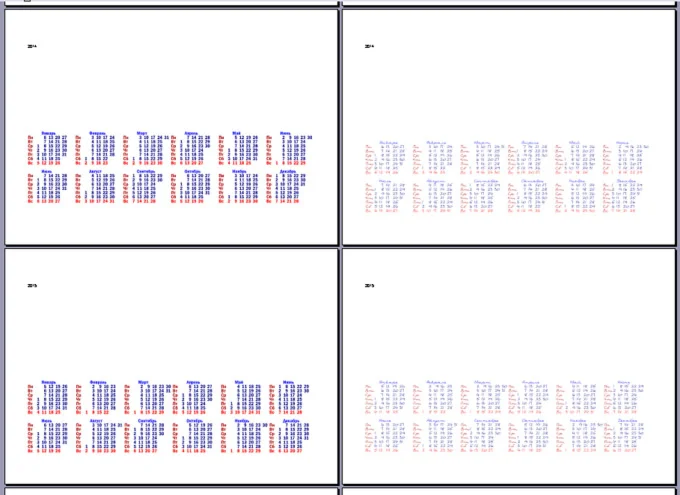 Календарные сетки в двух шрифтовых вариантах на каждый год. Годы 2013, 2014, 2015, 2016. Блоки месяцев 6х2. Векторные варианты в eps, cdr (в кривых и в шрифтах, возможно редактирование и смена шрифта), в формате wmf (универсальный векторный формат, картинку можно вставить в офисный документ. Также в архиве документ Word, где уже вставлены все календари в листы альбомной ориентации.
