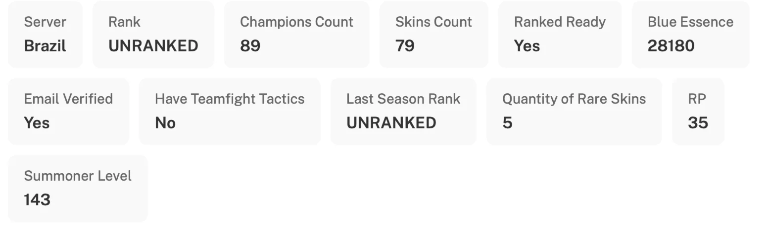 ???? Поднимите свой игровой опыт на новый уровень с этим премиальным аккаунтом League of Legends, включающим 143-й уровень и статус «Без рейтинга». Он включает 89 чемпионов, 28 180 единиц синей эссенции, 35 очков Riot Points и 5 редких обликов. Получите полный доступ к аккаунту Riot Games и привязанной к нему электронной почте, а также возможность привязать свой адрес электронной почты и номер телефона для персонализации.