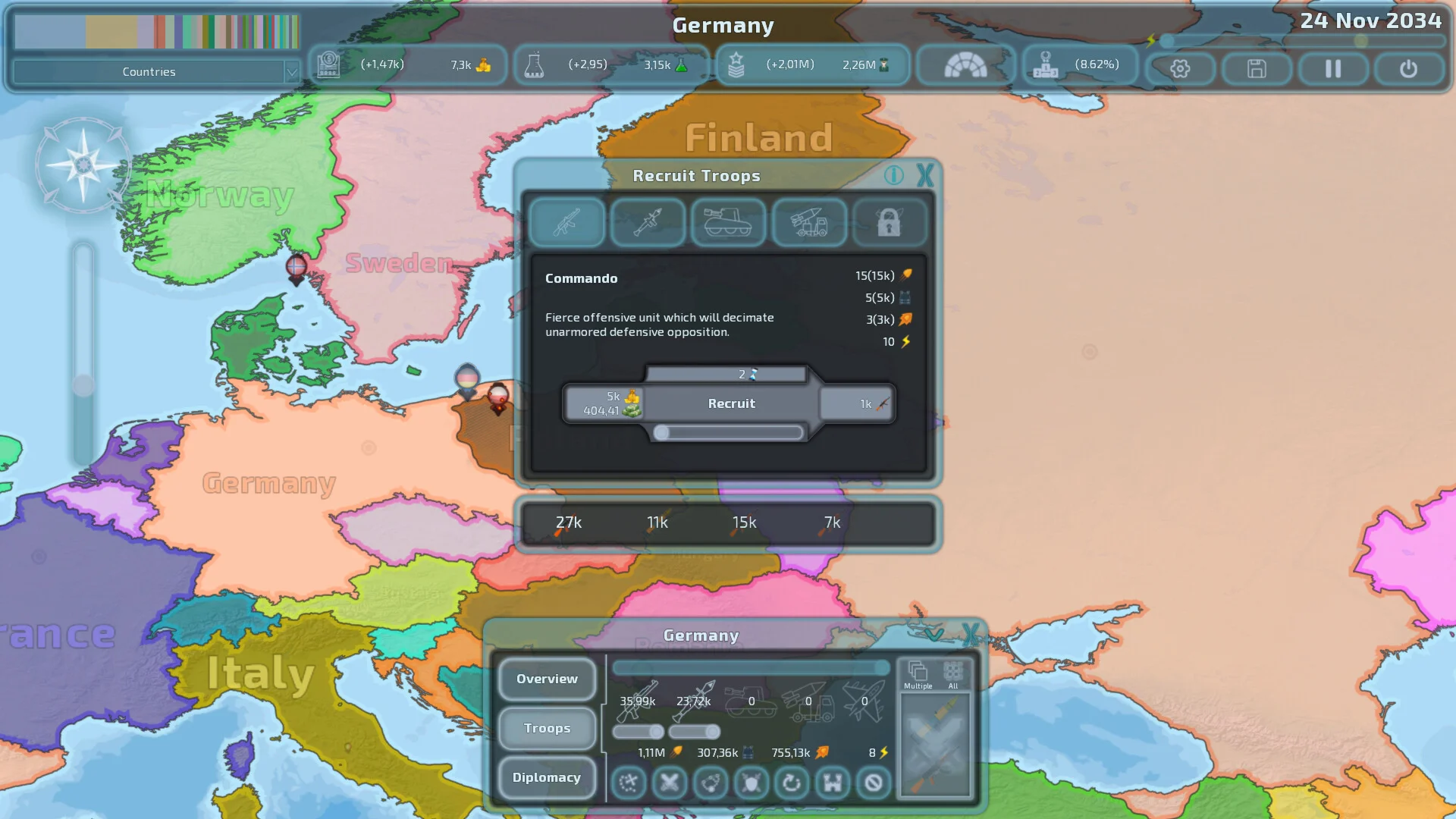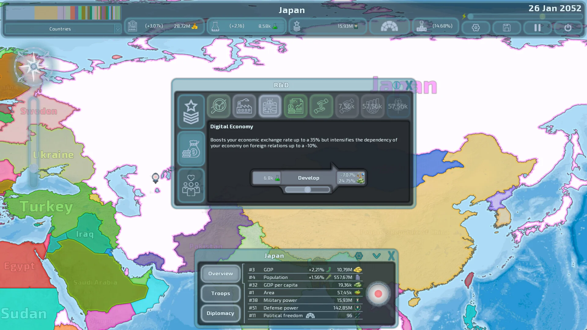 Геополитическая управленческая игра с постепенными аннексиями в реальном времени и оптимизированным игровым процессом, который сводит к минимуму громоздкие аспекты, сохраняя при этом абсолютную степень стратегического контроля.