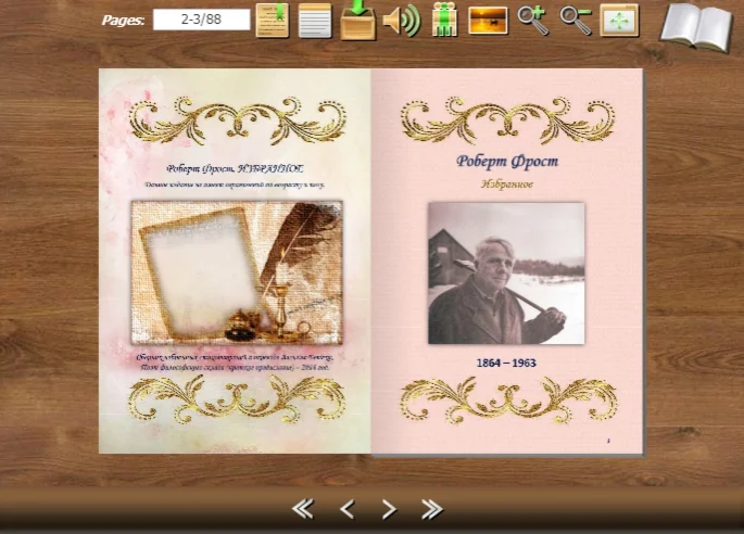 На выбор покупателя, предлагаются два варианта, 88 страничного, электронного издания, представленного в виде электронного документа в формате Pdf, 14,5 МБ, и электронной книги в формате Exe, 62,6 МБ, выполненной в виде книги с эффектом перелистывания страниц. С превью можно ознакомиться на сайте "Скит отшельника" проследовав в читальный подвальчик по следующей ссылке: http://skeet.gq/favorites-robert-frost.html или заглянув на сход (форум), кликнув сюда: http://skeet.gq/forum/index.php/topic,23.0.html