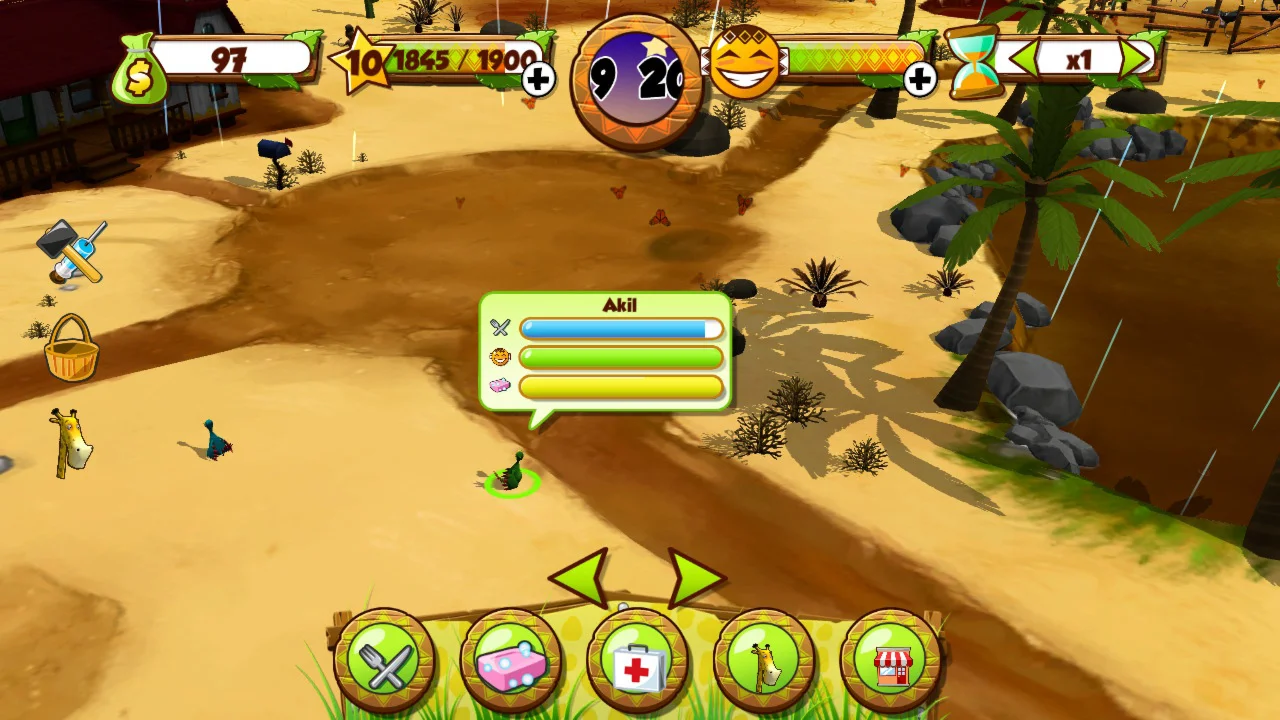 В начале игры у вас есть только пустое поле, несколько пенни и один маленький страус... Вам нужно кормить своего страуса, заботиться о нем и улучшать его образ жизни.Сытый семенами, ваш страус будет откладывать яйца, которые затем можно продать Лавочнику. На эти деньги вы можете купить новых животных на Фермерском рынке.Итак, цель игры — увеличить свой денежный счетчик, продавая яйца и другие продукты фермы, чтобы купить больше скота на Фермерском рынке и купить оборудование для своей фермы у Лавочника. Постепенно, по мере того, как ваша ферма будет расти, вы будете разблокировать определенные бонусы: ветряную турбину, тотем, сторожевую собаку, джип, барбекю и т. д.