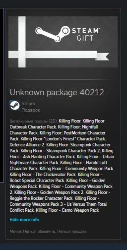 Включенные товары (20): Killing Floor, Killing Floor Outbreak Character Pack, Killing Floor: Nightfall Character Pack, Killing Floor: PostMortem Character Pack, Killing Floor "London's Finest" Character Pack, Defence Alliance 2, Killing Floor: Steampunk Character Pack, Killing Floor - Steampunk Character Pack 2, Killing Floor - Ash Harding Character Pack, Killing Floor - Urban Nightmare Character Pack, Killing Floor - Harold Lott Character Pack, Killing Floor - Community Weapon Pack, Killing Floor - The Chickenator Pack, Killing Floor - Robot Special Character Pack, Killing Floor - Golden Weapons Pack, Killing Floor - Community Weapon Pack 2, Killing Floor - Golden Weapon Pack 2, Killing Floor - Reggie the Rocker Character Pack, Killing Floor - Community Weapons Pack 3 - Us Versus Them Total Conflict Pack, Killing Floor - Camo Weapon Pack