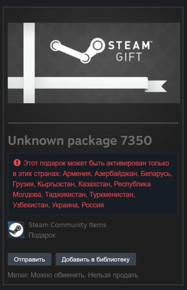 Этот подарок может быть активирован только в этих странах: Армения, Азербайджан, Беларусь, Грузия, Кыргызстан, Казахстан, Республика Молдова, Таджикистан, Туркменистан, Узбекистан, Украина, Россия