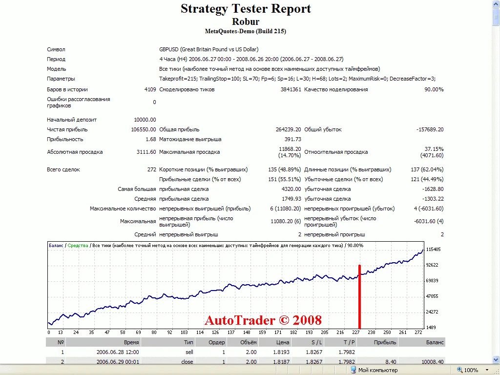 1. Результаты торговли советника Robur за 2 последних года по GBPUSD c реинвестированием и автоматическим расчётом лота. В качестве примера.