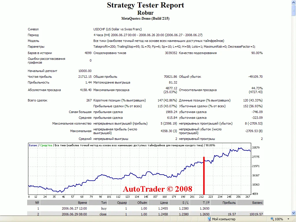 7. Результаты торговли советника Robur за 2 последних года по USDCHF постоянным 1.0 лотом. Среднемесячный профит 90п.