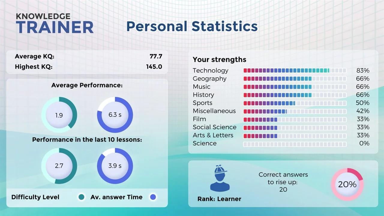 The smartest, most interesting trivia out there. It’s designed to stimulate your brain with over 5,000 high-quality, challenging, and informative questions. Each lesson tests your wits with 10 questions from 10 different categories. The difficulty level depends on you. Get an answer right and you'll move up a level. A wrong answer leads to an easier question. But you'll want to move up to improve your Knowledge Quotient, which is recalculated after every round. In a multiplayer game, up to 4 players can compete.