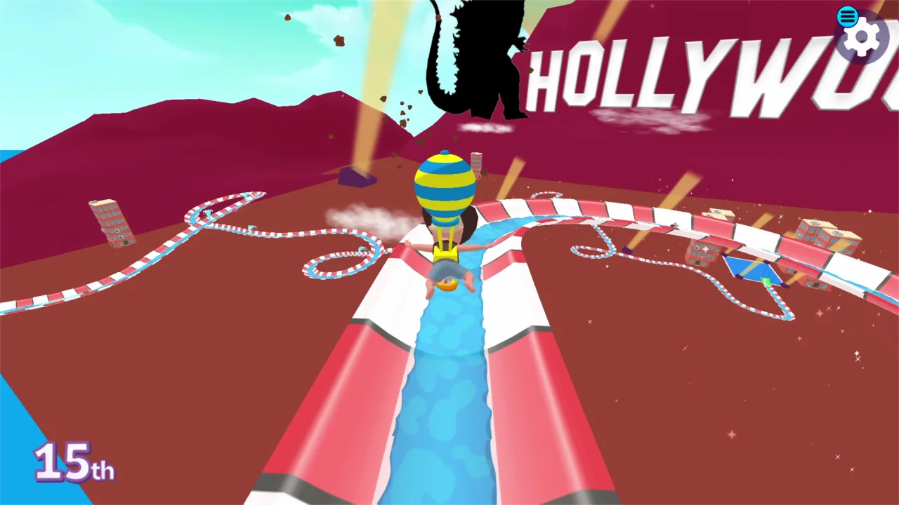 Скатись по огромной водной горке, спиралью спускающейся с небес, обгони друзей, столкни их с трассы или используй усиления, чтобы получить преимущество. Самое забавное — можно в любой момент спрыгнуть с трассы и приземлиться на нижний уровень, мгновенно обогнав всех!