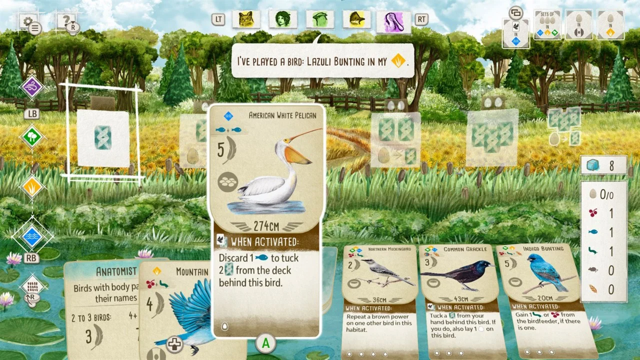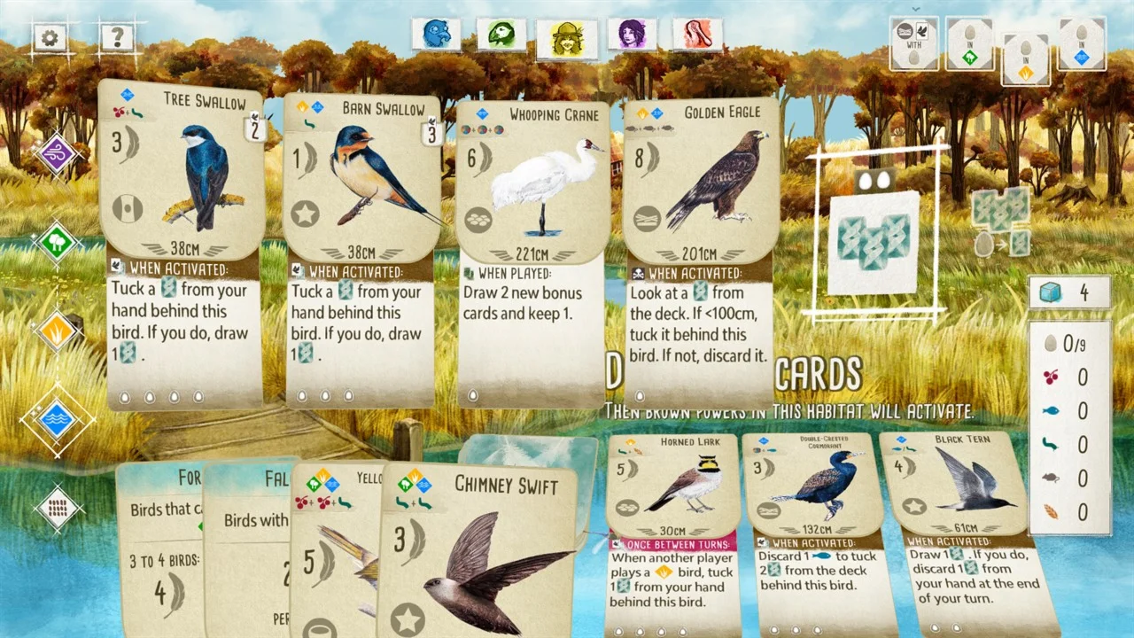 Собирайте партии до 5 игроков и соревнуйтесь в создании лучших заповедников. Помните, число ходов ограничено! Каждая птичка в вашей колоде улучшает показатели откладывания яиц, вытягивания карт или сбора еды. Многие из 170 уникальных видов обладают теми же способностями, что и в реальной жизни: ястребы будут летать на охоту, пеликаны ловить рыбу, а гуси объединяться в стаи.