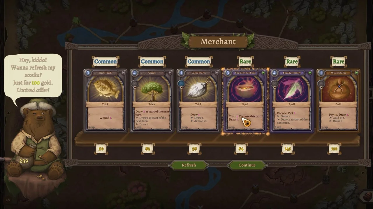 Throughout your journey, you will encounter unique forest inhabitants, explore four diverse regions, and collect powerful items and cards that will empower your hero. Your ultimate path will lead you to the royal castle, where you'll strive to reach the throne room.