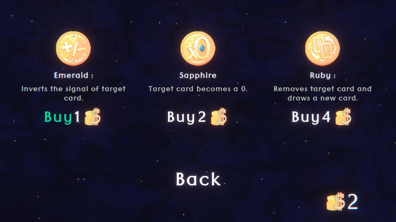 Make effective use of the numerical relationships between the cards and their positions to keep the final sum as close to zero as possible. If you play well, you’ll earn money to buy magical coins that modify the cards on the board. Manage these resources wisely to get as far as you can — and beware of RNGesus.