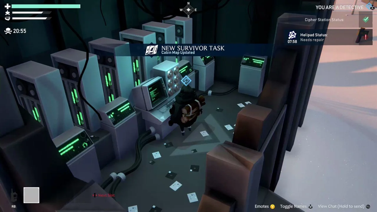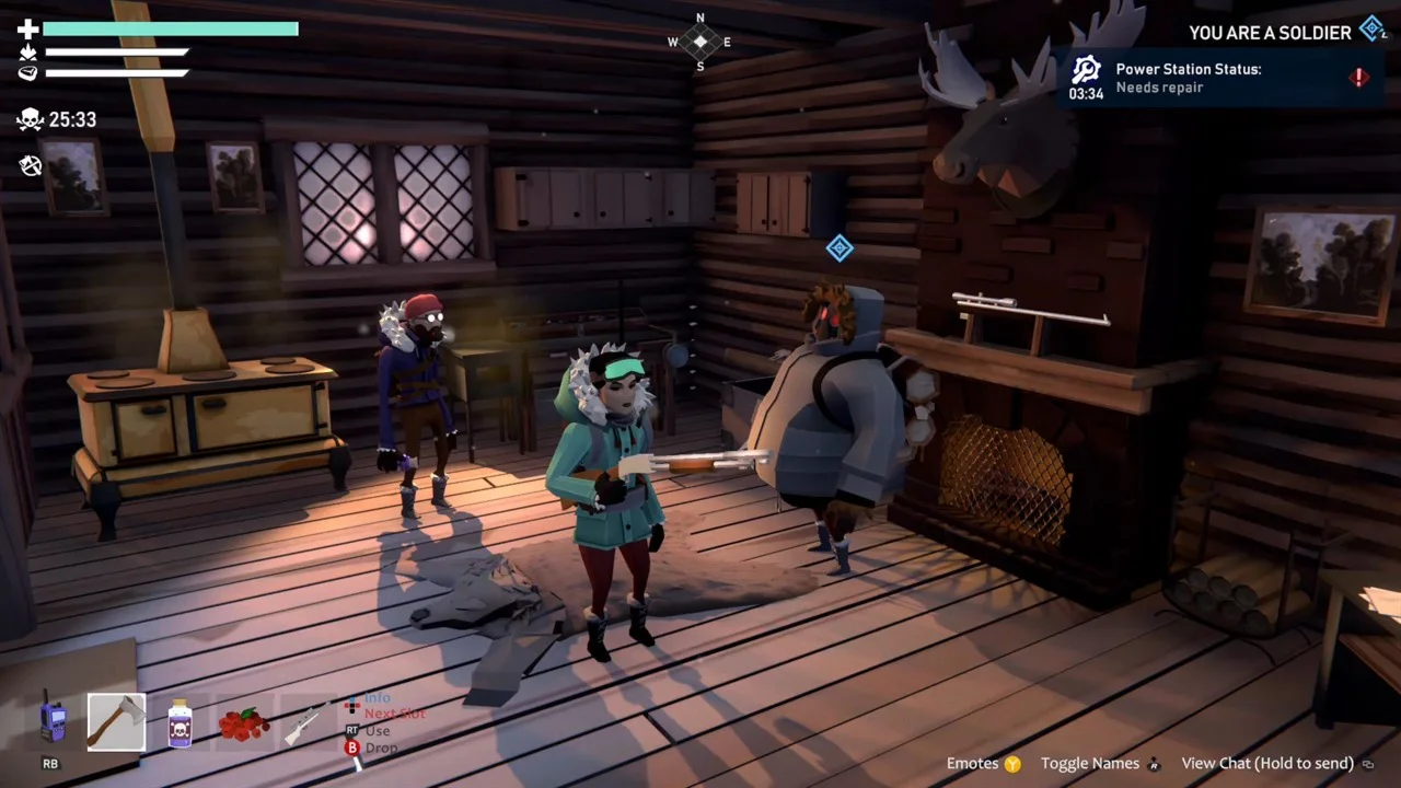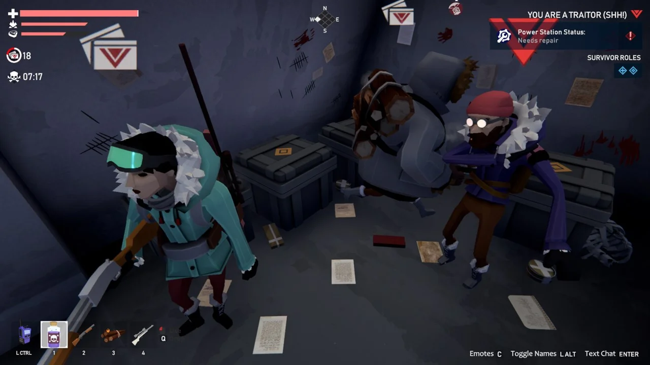 No two matches are ever the same. Whether you’re chopping firewood with allies, whispering over secret radios as a traitor, or panicking when a sudden blizzard forces everyone together, the tension builds with every decision.