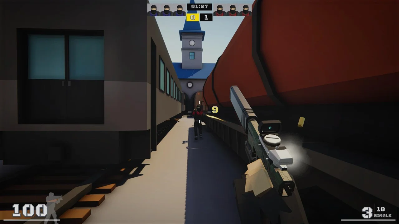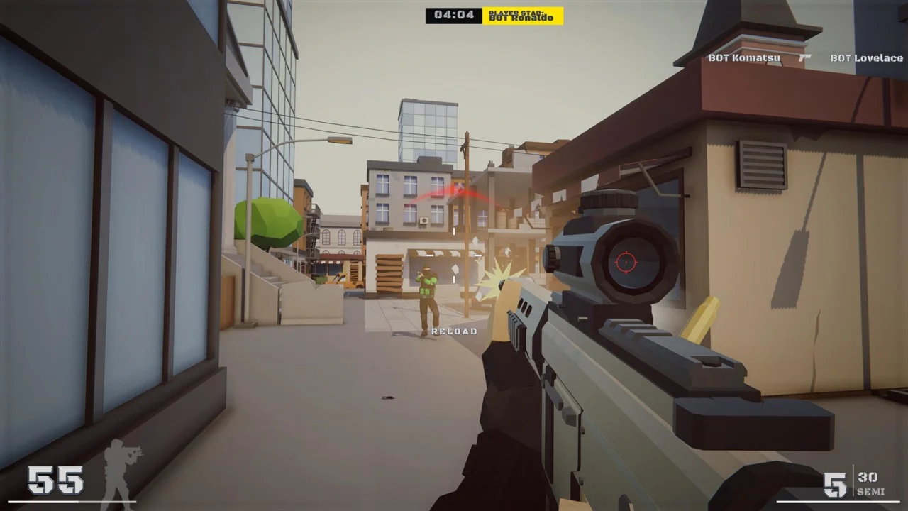 Choose from three different difficulties namely casual, intermediate and pro and from three different game modes, deathmatch where you fight against opponents and the player with the most kills wins the game, Elimination where the team wins with at least one player left wins the round and Gunrace where you get for each killstreak a new weapon and if you reach the 11th killstreak you win.