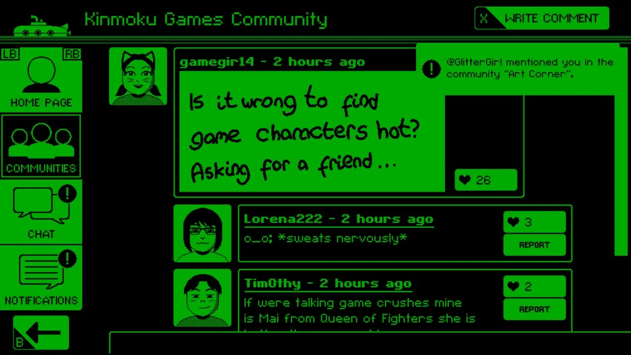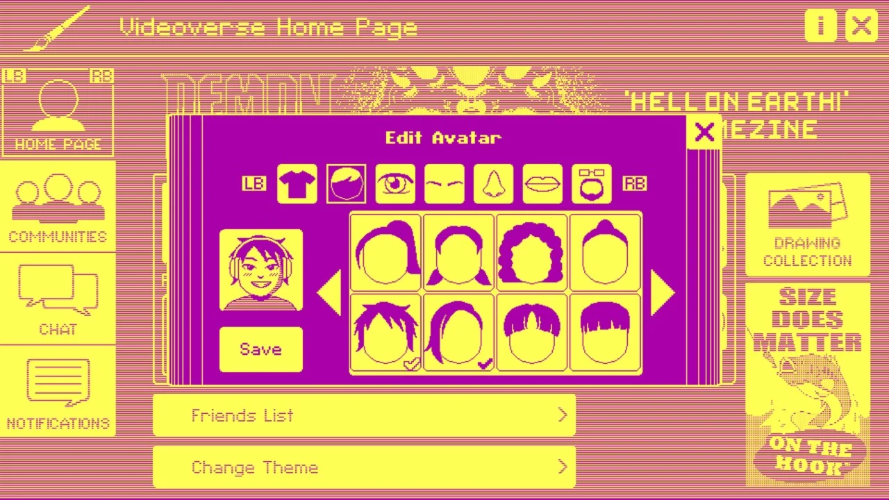 Познакомьтесь с обширной галереей персонажей, откройте множество побочных историй, наслаждайтесь пиксельными рисунками и узнайте правду о проблемной социальной игровой сети! Настройте свой опыт в Videoverse, выбрав аватар, личную цитату и любимую тему.