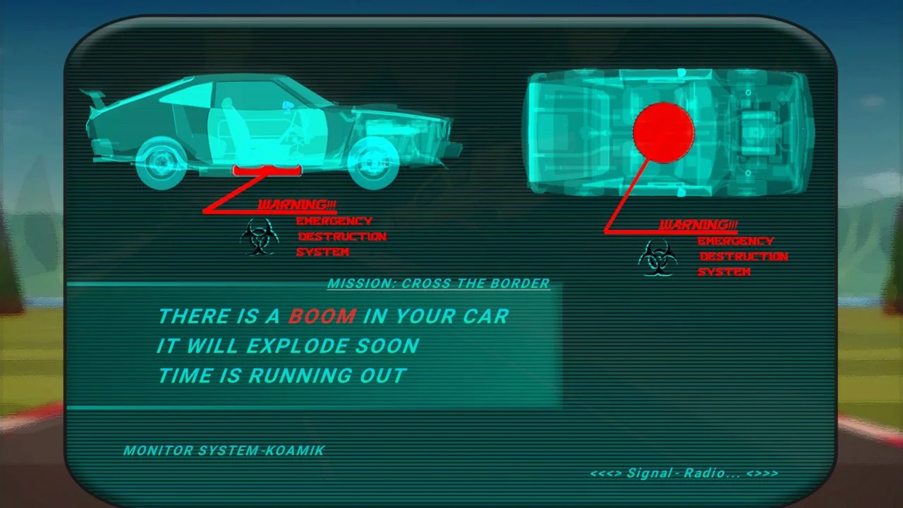 Mission: "a car bomb under your feet" -> If you don't want to see chunks of your vehicle flying off, maintain your concentration in the race of your life. Escape to the border as fast as you can, and before the countdown reaches <(00:00)>.