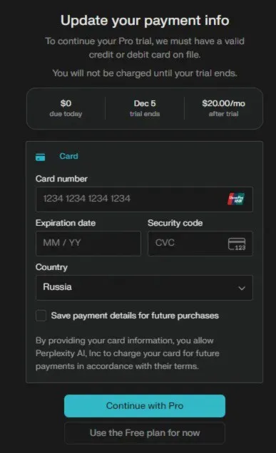 Фиксированный номинал » Виртуальная карта для Perplexity Бесплатный план-Привязка карты