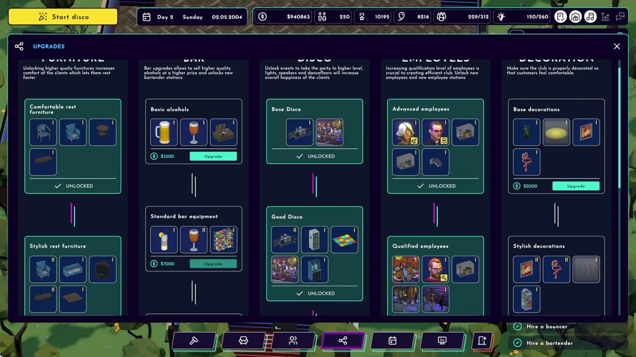 Инвестируйте в модернизацию, чтобы создать настоящий рай для любителей ночной жизни. Улучшайте мебель, освещение, звуковые системы и декор. Расширьте команду, повысьте уровень обслуживания и сделайте свой клуб лучшим местом для вечеринок!