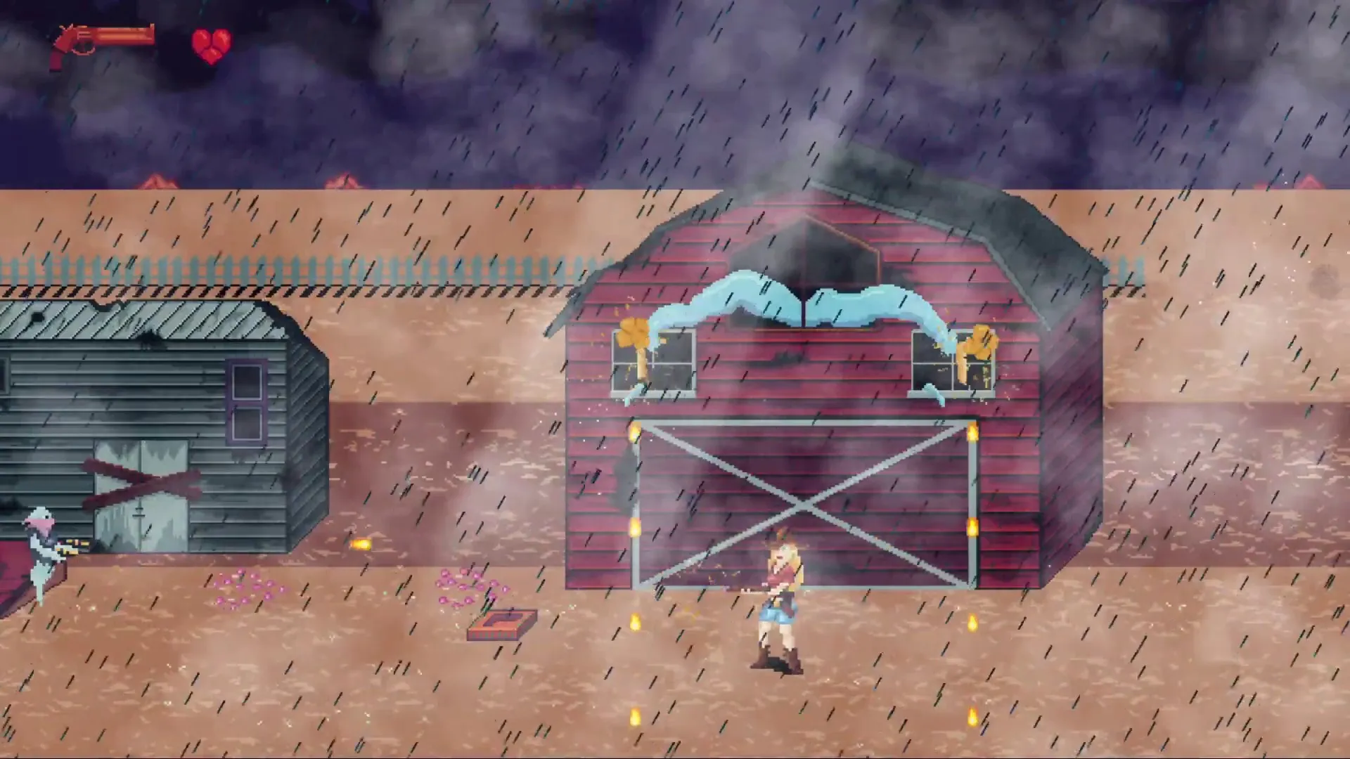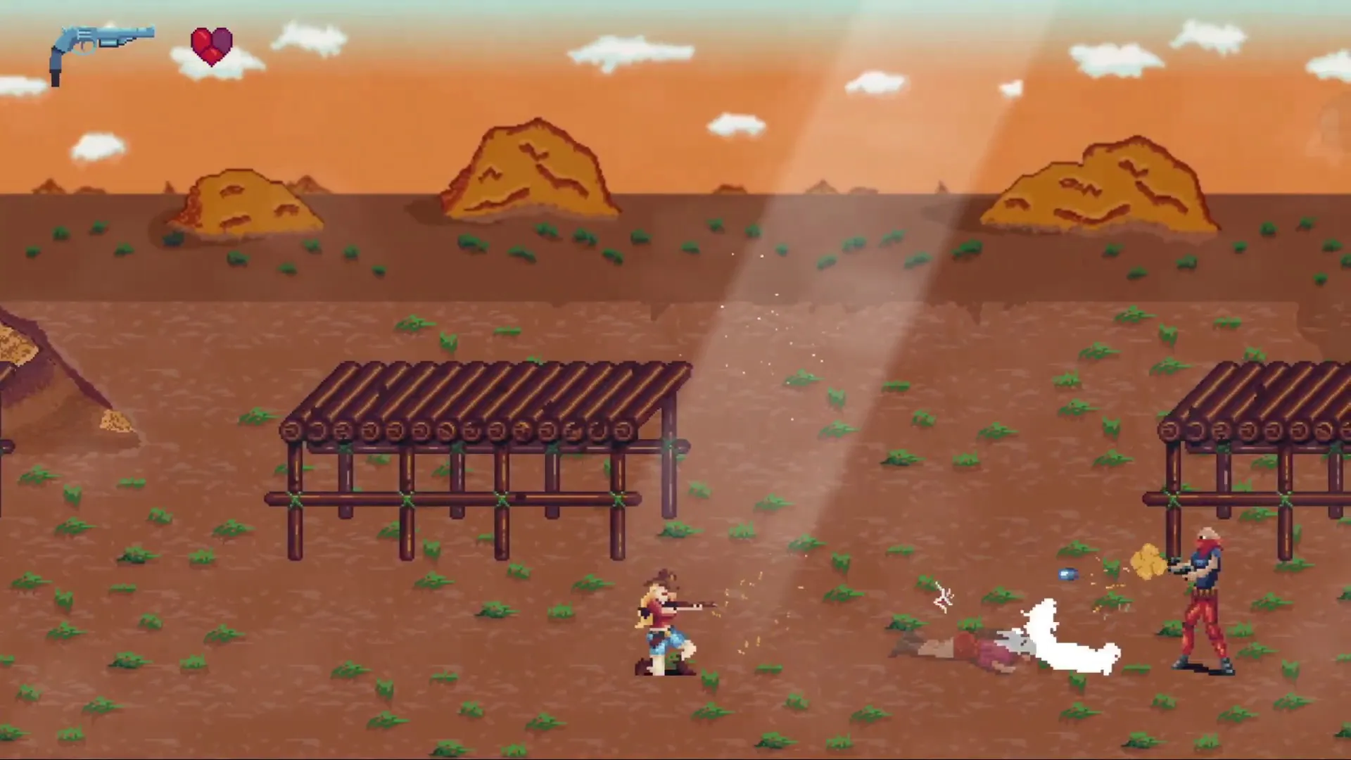 Saddle up for a supernatural wild west adventure! Choose to play as Roland or Robin and investigate a mysterious desert mansion. Master 8-directional shooting as you battle outlaws and beasts through treacherous levels. Discover powerful weapon upgrades, but be warned - death means losing them all! Unravel a dark secret through story-driven cutscenes and face off against challenging bosses in this thrilling 2D side-scrolling shooter.