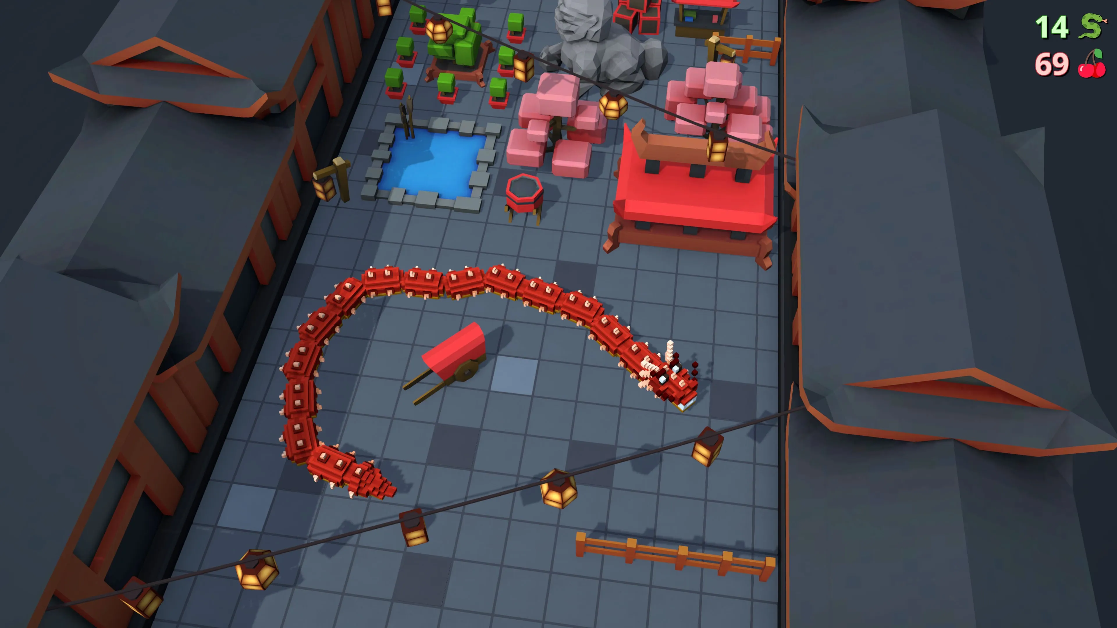 Snaky Snakes is an exhilarating game where player control a snake through randomly generated obstacles while collecting cherries. Each cherry increases the snake's length and score. Additionally, player can use cherries to purchase new environments such as Desert, Asia, and Ballroom from the in-game shop. The objective is to achieve the highest score possible and unlock all environments.