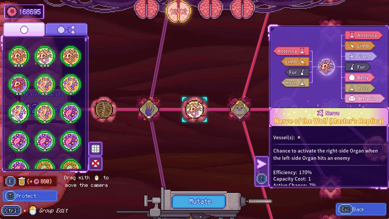 В игре представлены сотни органов с различными функциями. Каждый орган может быть мутирован, чтобы получить дополнительные аффиксы, которые могут генерировать еще больше непредсказуемых изменений.