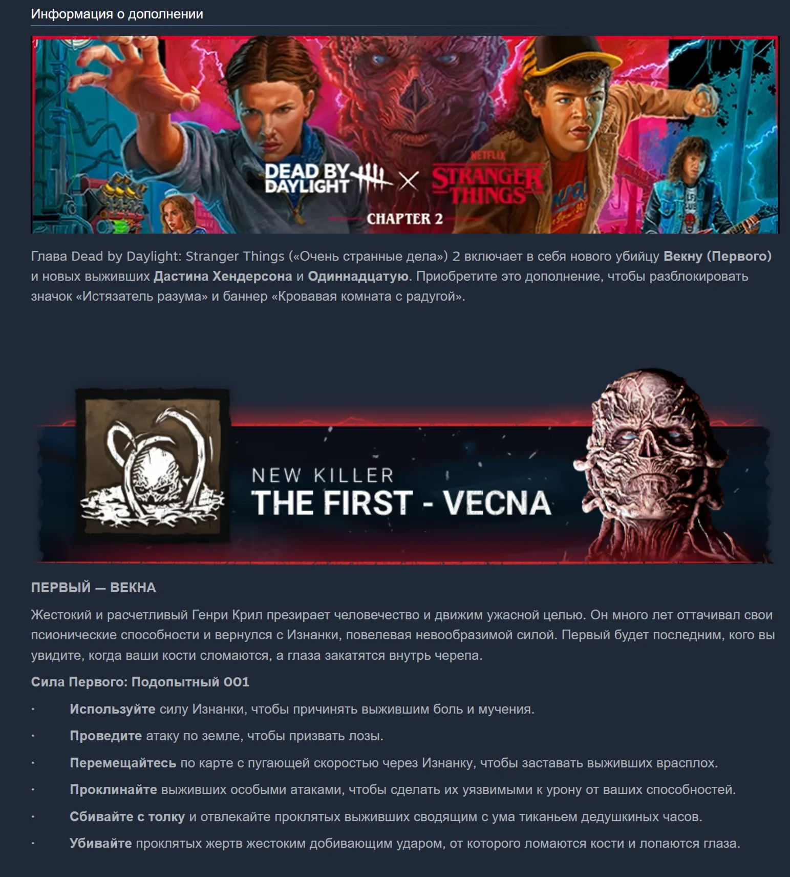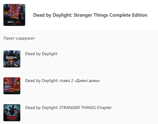 Dead by Daylight: Stranger Things Edition включает в себя базовую игру, главу «Очень странные дела» и главу «Очень странные дела: Глава 2».
