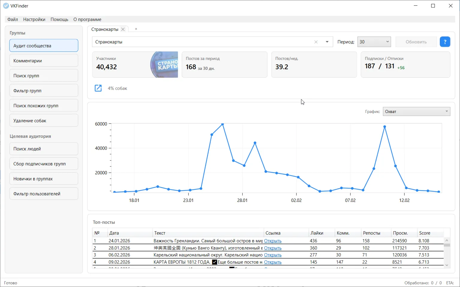 - **Аудит сообщества** — дашборды по активности: посты, охваты, ER, динамика, топ‑посты; помогает оценить площадку перед покупкой рекламы.
