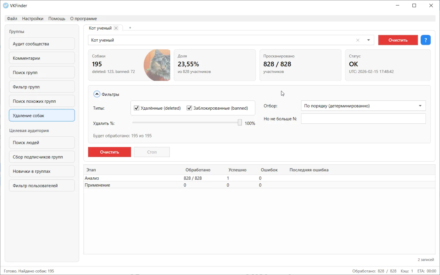- **Удаление «собак»** — поиск и массовое удаление/бан заблокированных и удалённых аккаунтов из ваших групп с учётом лимитов VK.