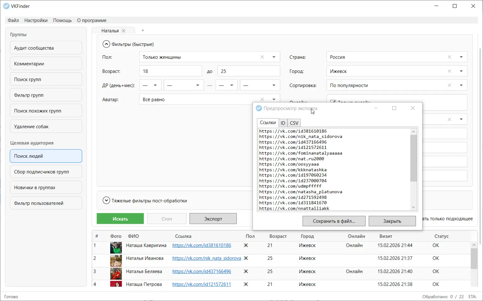 VKFinder — это офлайн‑программа для профессиональной работы с ВКонтакте: поиска целевых сообществ, анализа их активности, сбора и фильтрации аудитории, а также обслуживания своих групп (аудит, модерация, чистка подписчиков).