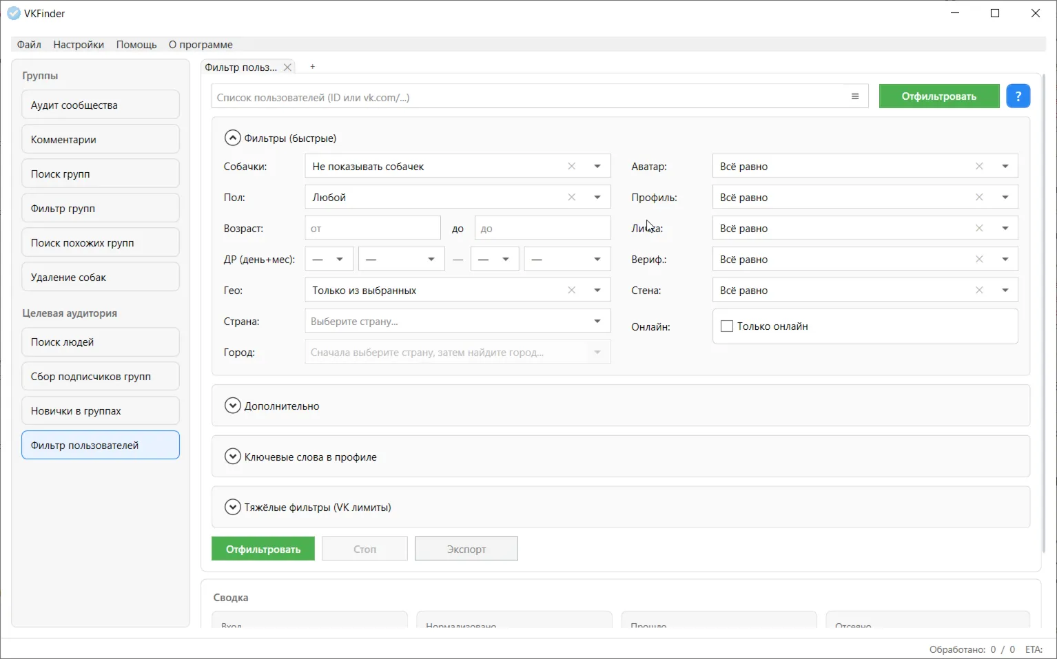 - **Фильтр групп и пользователей по списку** — прогон готовых списков через мощный фильтр (по данным сообщества/профиля) с потоковым экспортом для больших объёмов (десятки тысяч строк).