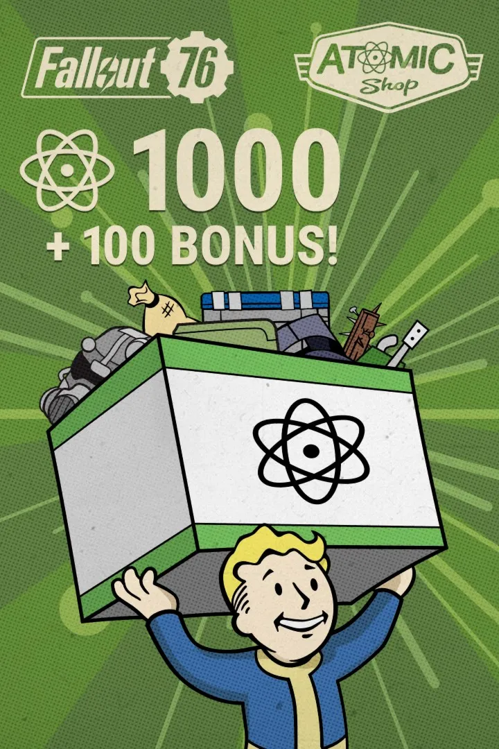 Купите 1000 (+100 Бонус!) Атомов, в-game валюты, которую вы можете использовать в Atomic Shop для покупки новых нарядов, кожаных накладок на оружие, кожаных накладок на броню, эмоций, декора и многое другое!