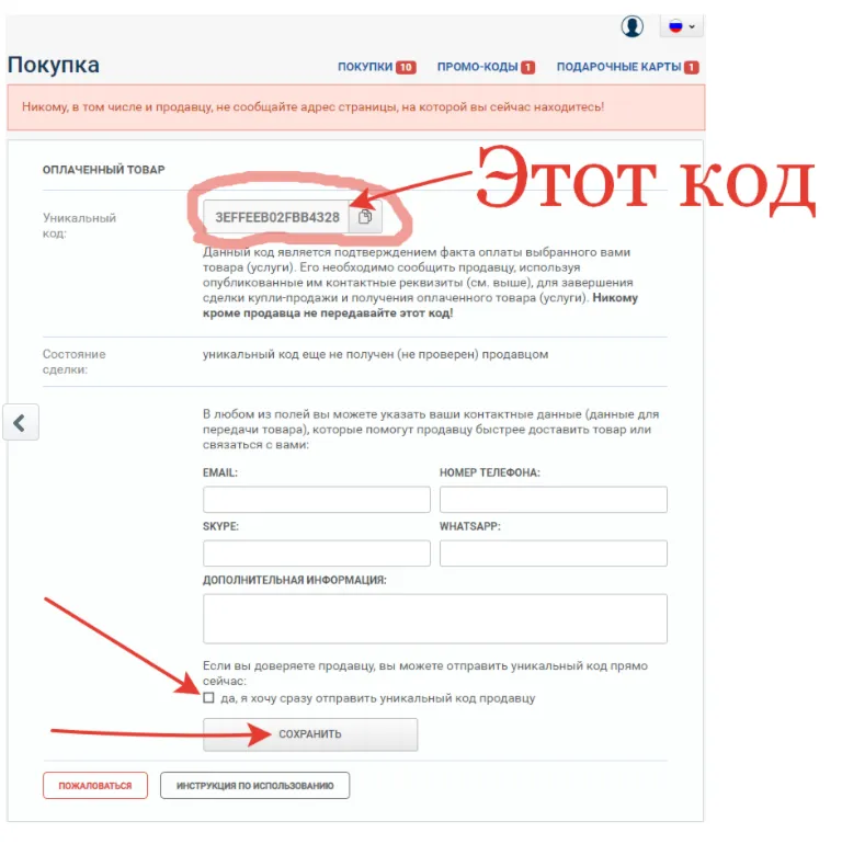 2) Нажмите "СОХРАНИТЬ". (Код будет отправлен продавцу автоматически).