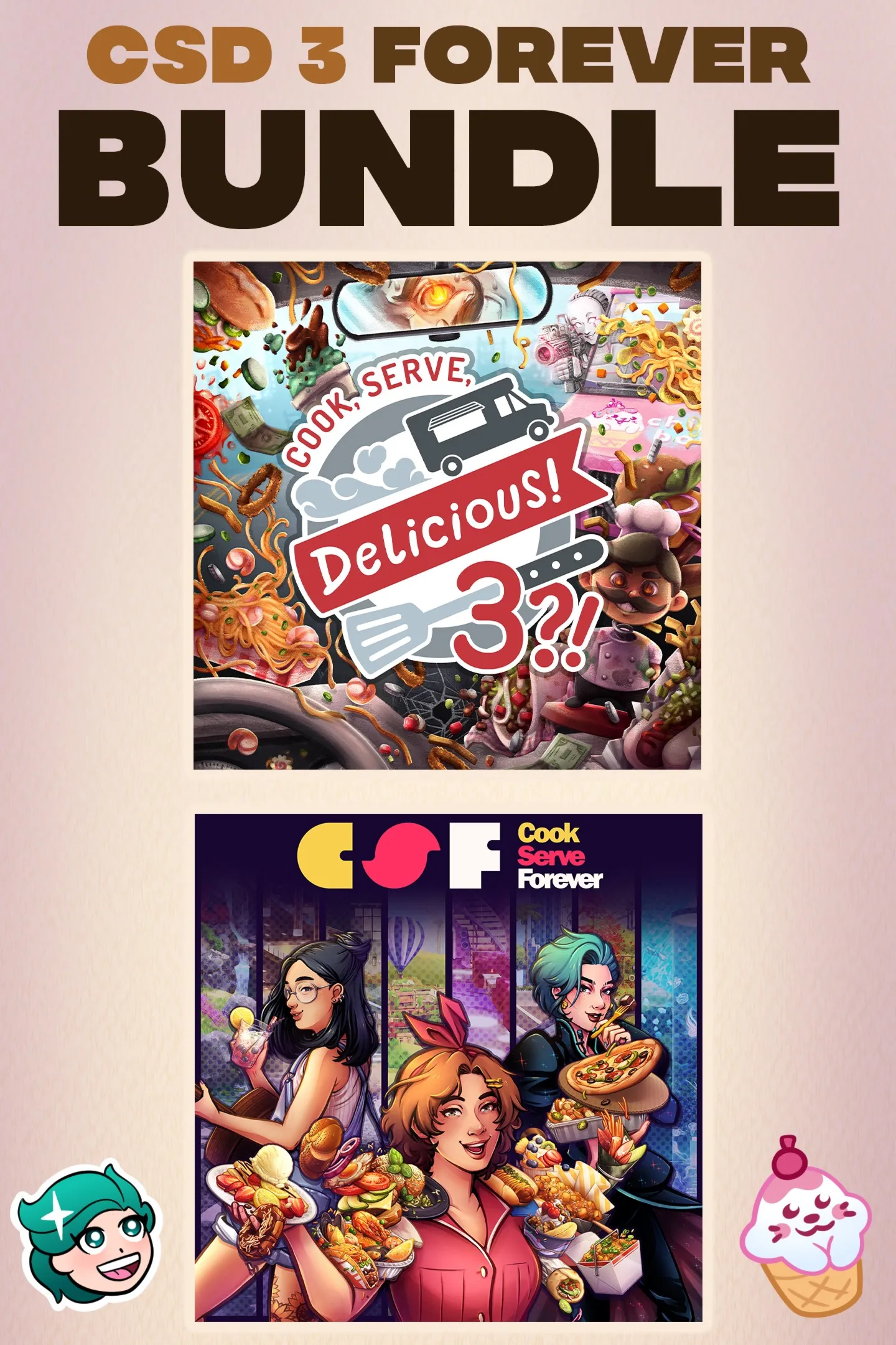 Два невероятно вкусных игры! "Cook Serve Forever" - окуньтесь в красоту, звуки и историю Cook Serve Forever, повествовательной игры по приготовлению пищи, где вы обслуживаете вкусные рецепты голодным массам Хелиануса. "Cook, Serve, Delicious! 3?!" Приготовьте, обслуживайте и управляйте своей фуд-трюком, когда вы выносите сотни различных блюд по разорённой Америке в этом гигантском сиквеле миллион-бестселлера!