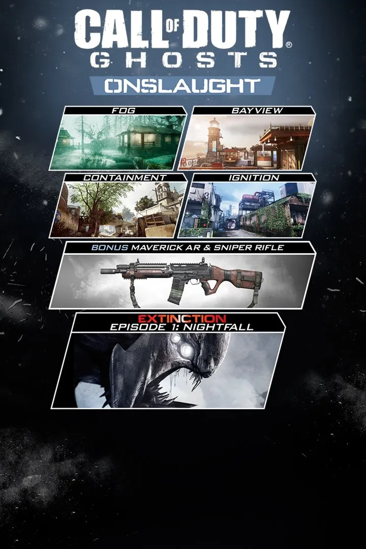 Добро пожаловать в **Call of Duty®: Ghosts Onslaught**, первый DLC-пак для **Call of Duty®: Ghosts**, который предлагает четыре уникальные карты для multiplayer, каждая со своими уникальными окружениями, размером и разнообразием геймплея; а также смертоносное новое дополнение к вашему арсеналу — **Maverick**, универсальная **Assault Rifle/Sniper Rifle**. Якорем этого первого контент-пака является **Episode 1: Nightfall**, первая часть четырехсерийного нарратива **Extinction**, где небольшая команда получает задание добыть ценную разведданные из удаленного объекта в аляскинской глуши. **Episode 1: Nightfall** включает два совершенно новых вида инопланетян и эксклюзивное оружие.