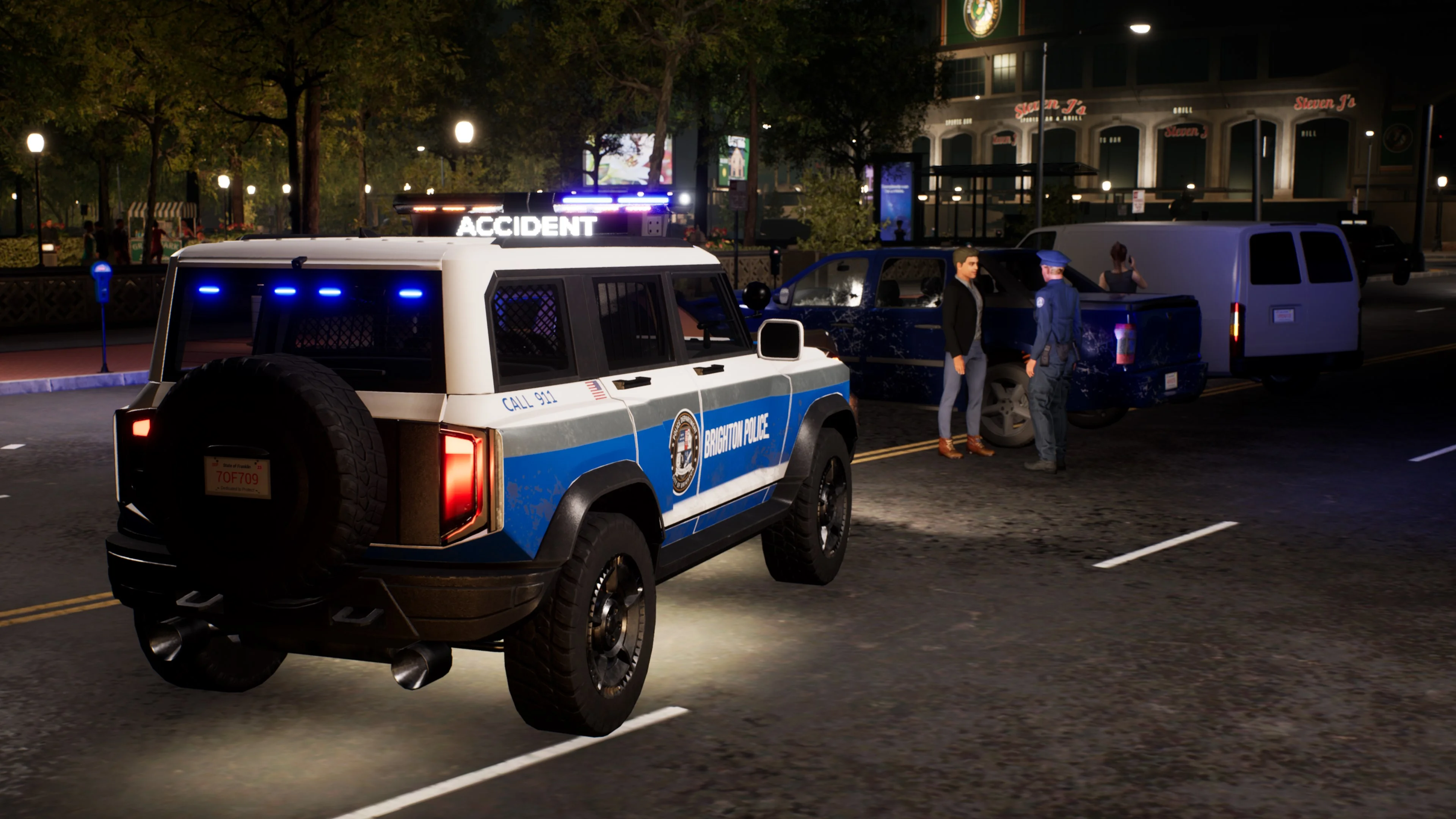 В полицейском автомобиле Warden Police Vehicle сверху установлена световая панель которая может отображать сообщения для обеспечения безопасности мест дорожнотранспортных происшествий в ночное время а также для установки дорожных заграждений или подачи сигнала остановиться нарушителям правил дорожного движения