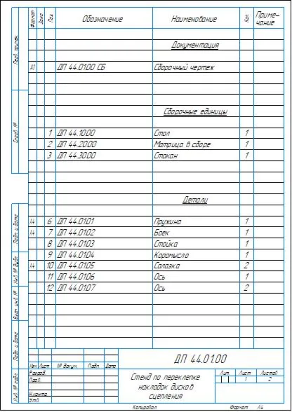 Сборочный чертеж и спецификация для стенда по переклепки накладок дисков сцепления. Чертеж и спецификация выполнены в программе Компас 3D