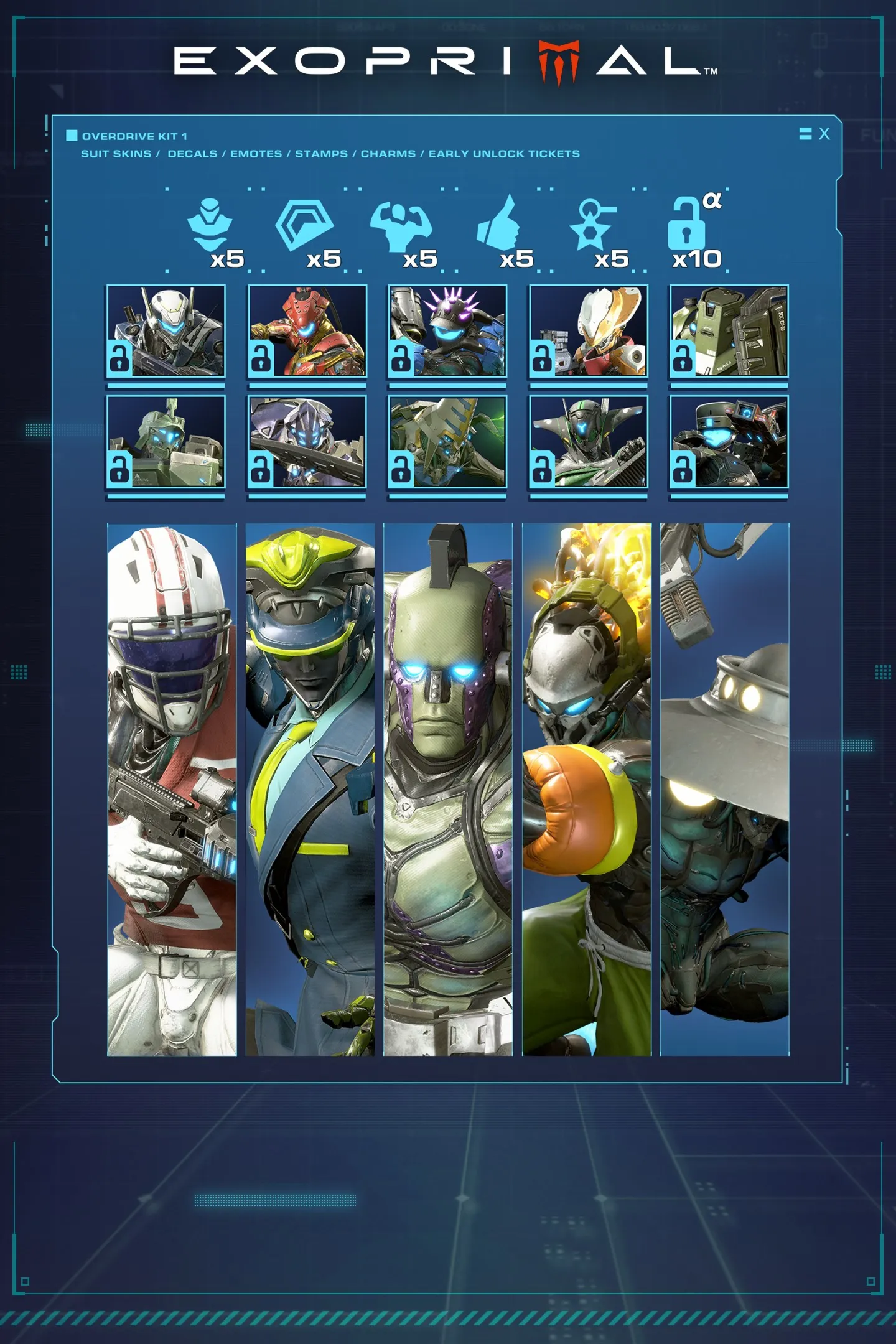 В каждый из перечисленных ниже комплектов входят: 1) облик экзоскелета; 2) наклейка; 3) эмоция; 4) штамп; 5) талисман.