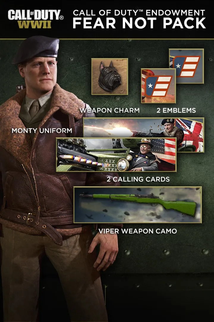 Код Duty™ Endowment (C.O.D.E.) Fear Not Pack включает в себя специальную памятную в-game униформу, оружейную каму, оружейный амулет, а также два Calling Cards и два Эмблемы. Покупка этой упаковки помогает ветеранам найти высококачественную работу. 100% полученных средств, полученных Activision за эту упаковку, будут переданы в Call of Duty Endowment и напрямую пойдут на финансирование некоммерческих организаций, которые помогают ветеранам найти высококачественную работу. © 2018 Activision Publishing, Inc. ACTIVISION, CALL OF DUTY, и CALL OF DUTY WWII являются товарными знаками Activision Publishing, Inc. Все другие товарные знаки и наименования являются собственностью их соответствующих владельцев.
