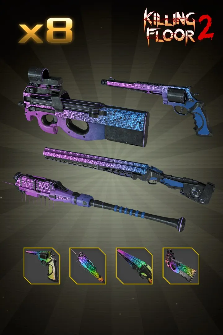 Содержит 8 тематических кож для оружия (4 динамические и 4 динамические RBG) Оружие, представленное в этом наборе: 500-калиберный револьвер, Домский кулак, Хемоклоббер, П90.