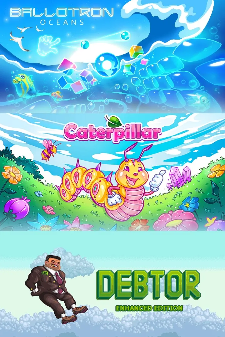 Три логические игры в одном бандле! Добро пожаловать в следующую часть Ballotron! Вы тоже стреляете шарами, но все происходит под водой. Заставьте Blue Ball ударить Green Ball, чтобы достичь цели. Стреляйте Small Balls, чтобы попасть по Large Balls и Bubble Blocks. На этот раз решения уровней будут еще веселее! Debtor: Enhanced Edition — это ретро-стильный puzzle platformer. Чтобы выбраться с каждого уровня, нужно собрать все монеты и создать путь к выходу уровня. Это опасное место, полное ловушек и беспощадных врагов, будьте осторожны! Caterpillar — это 2D puzzle platformer. Вы управляете гусеницей, цель которой — собрать все цветы и перейти на следующий уровень. Гусеница не может прыгать сама, только двигаться и карабкаться по вертикальным стенам. Это казуальная игра, погружающая в атмосферу безопасности и медитативности. Можете ли вы помочь Гусенице стать Бабочкой?