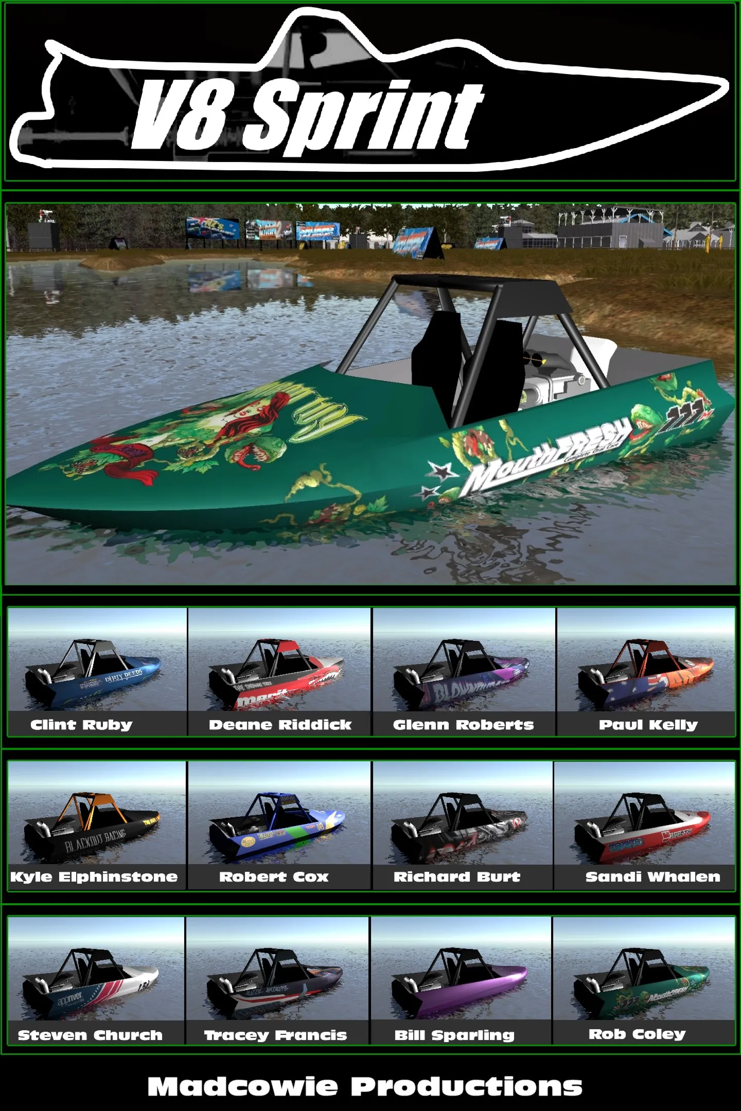 V8 Sprint - это гонка на скорость на катере с 1000+ л.с. где вы гонитесь против времени, чтобы управлять катером через извилистую трассу в считанные футы воды на 24 требовательных этапах.
