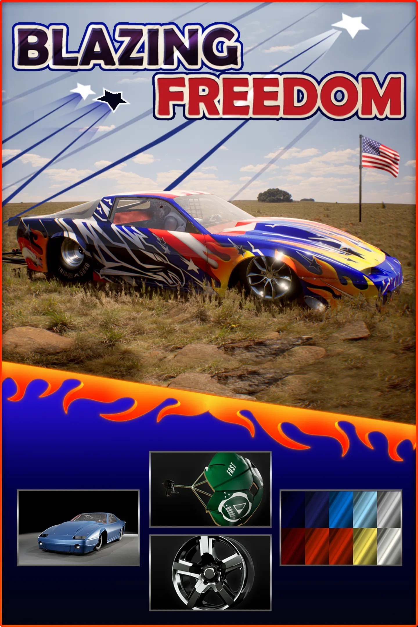 С набором «Пламя свободы» для игры Street Outlaws 2: Winner Takes All вы получите эксклюзивную патриотическую окраску, новые диски, обвесы, набор бело-синих красок и парашют «Быстрые турбины». Идеальный набор для празднования Дня независимости.
