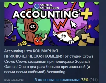 Accounting+ это КОШМАРНАЯ ПРИКЛЮЧЕНЧЕСКАЯ КОМЕДИЯ от студии Crows Crows Crows созданная при поддержке Squanch Games! Она в два раза больше оригинальной (и всеми-всеми любимой) Accounting.