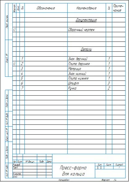 Сборочный чертеж и спецификация на прессформу для получения кольца. Чертеж и спецификация выполнены в программе Компас 3D