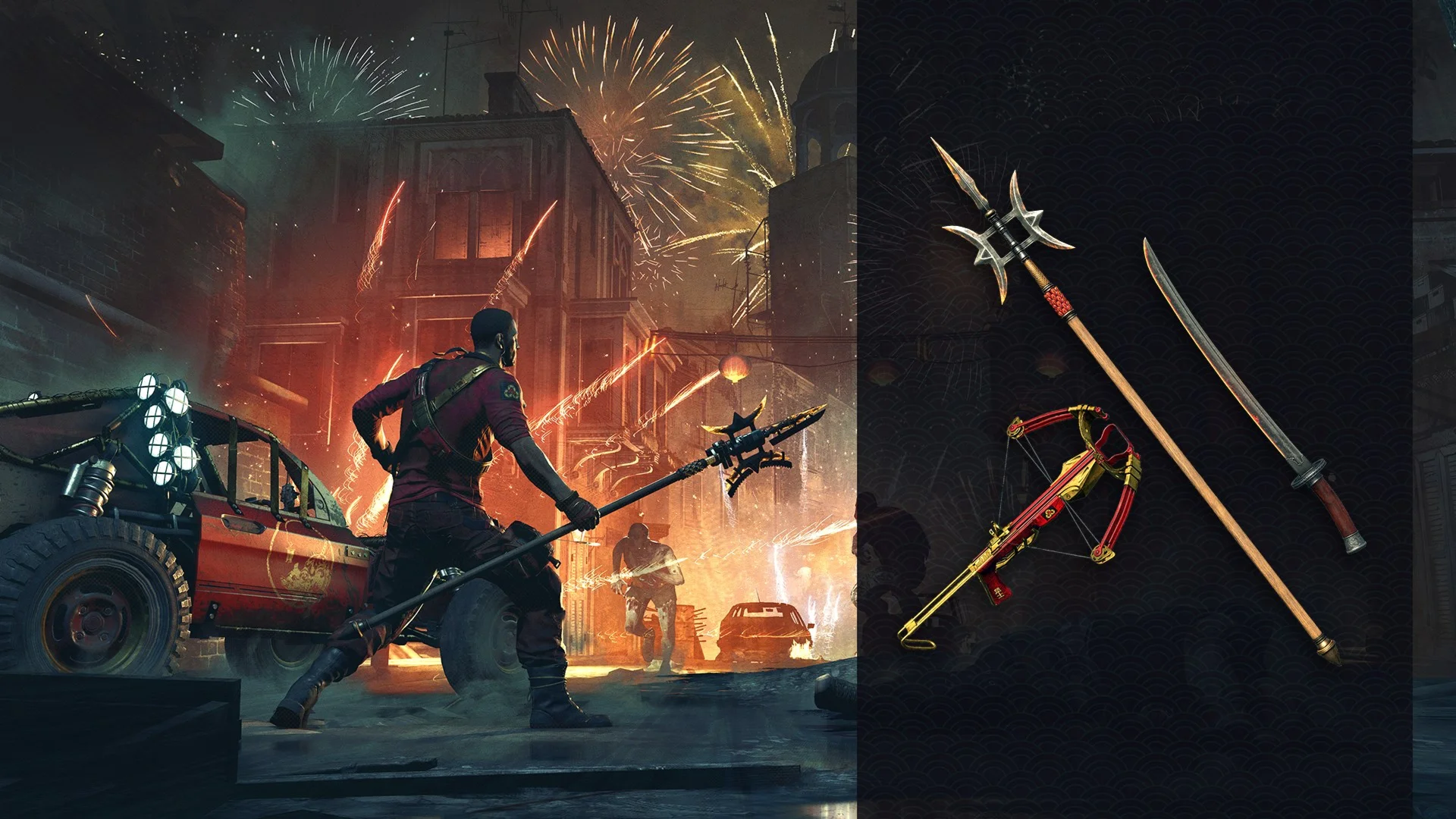 Уничтожайте зомби в обличии воина Шу Помимо нового наряда мешающего мертвецам схватить вас в этот набор в честь китайского Нового года входит новая окраска и три чертежа оружия Арбалет Порыв ветра не требует дополнения The Following а меч Прыжок тигра Дао и оружие Дракон Цзи пробуждают древнюю силу когда вы наносите несколько ударов подряд Также Дракон Цзи позволяет проводить особенно разрушительные атаки Примечание для окраски необходимо дополнение Dying Light The Following