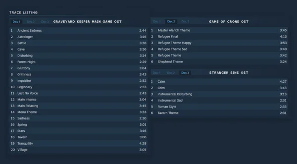 The complete soundtrack used in Graveyard Keeper.